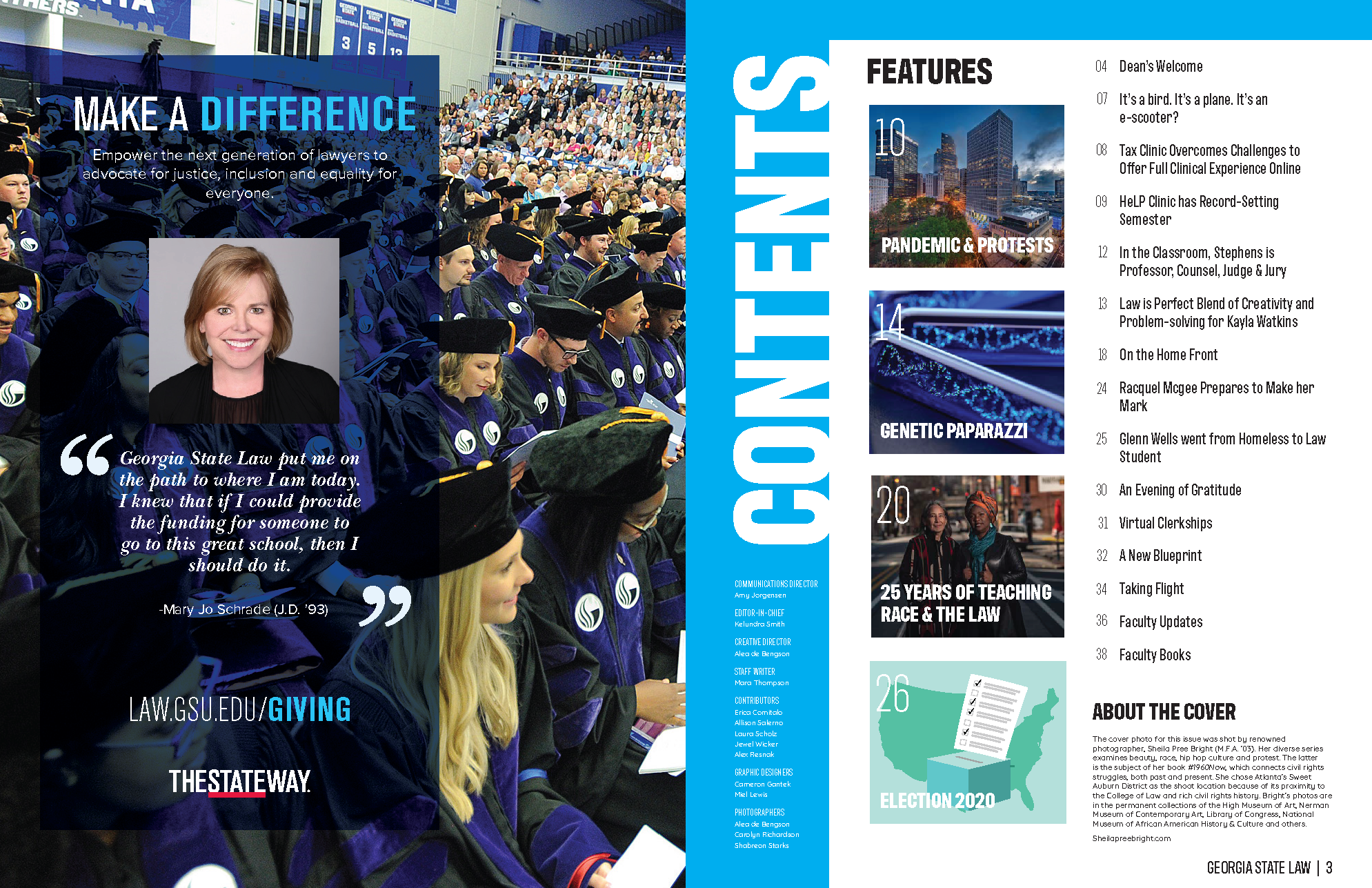 Creative director and designer for the Georgia State Law Magazine. Oversaw the project from concept to completion. Contributing designers were Cameron Gantek and Miel Lewis. The magazine demonstrates diverse expertise at Georgia State University College of Law. Featuring professors Natsu Taylor and Tanya Washington.